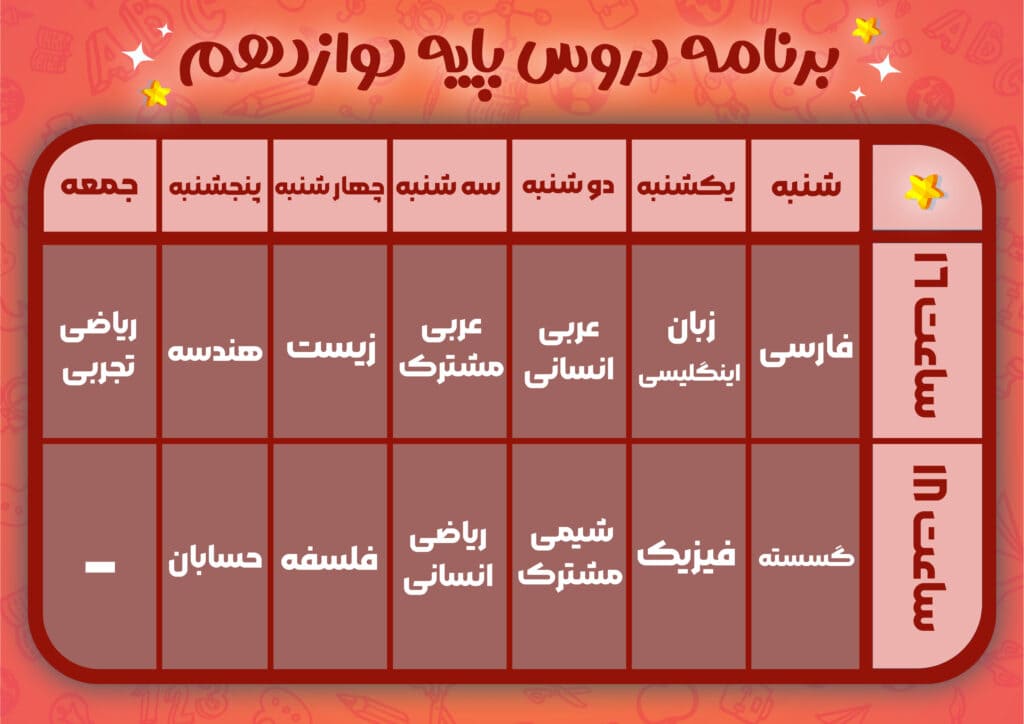 همانطور که در برنامه هفتگی مشاهده میکنید، تمام دروس وجود داشته و متناسب با رشته شما، برنامه برای شما طراحی شده است. این پکیج، برای شما به راحتی شما را در زمینه درس هایتان پیشرفت خواهد داد.